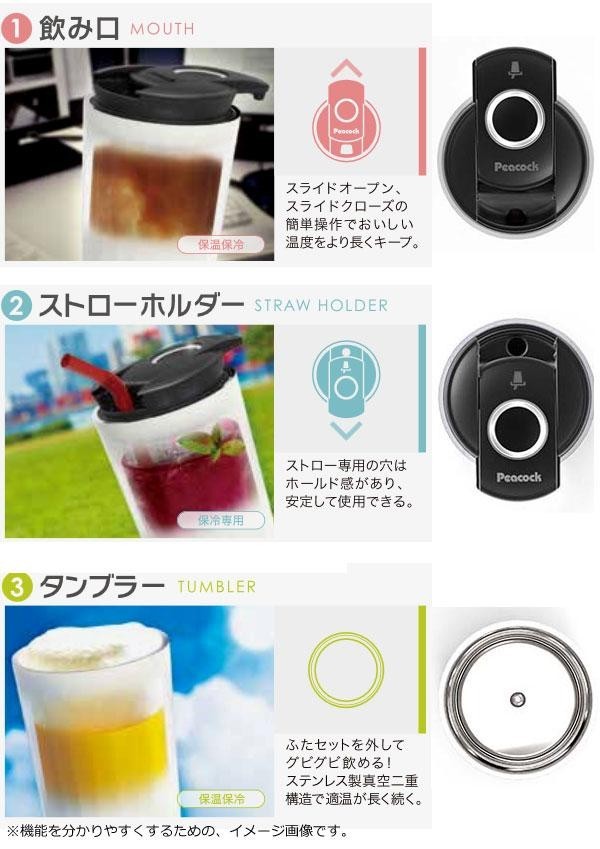 飲み口からそのまま飲む、ストロー専用穴にストローを差して飲む、ふたをセットしてグビグビ飲む、と3種類の飲み方が楽しめるタンブラーです。ドリンクホルダーにも置くことができます♪(ドリンクホルダーのサイズに合わない場合もございます) |