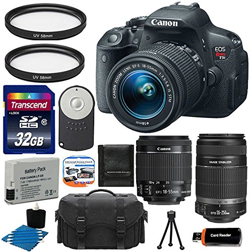 The EOS Rebel T5i DSLR Camera with 18-55mm Lens from Canon is an APS-C format digital SLR camera with an 18MP CMOS sensor and the DIGIC 5 image processor. It is combined with the EF-S 18-55mm f/3.5-5.6 IS STM lens for an effective range of wide-angle to standard focal length. With 14-bit Analog/Digital conversion, an ISO range from 100-12800 (expandable to 25600) and Multi Shot Noise Reduction, the Rebel T5i offers sharp details, accurate colors and low-noise imaging in both bright and low-light shooting situations. Its 9-point all cross-type autofocus system provides fast focusing when shooting with the viewfinder, and Hybrid CMOS AF increases autofocus speeds when shooting in Live View. The Rebel T5i can continuously shoot up to 5 fps. A 3.0" Clear View II Vari-angle Touchscreen LCD with 1,040k-dot resolution provides composition and playback viewing. Its tilt and swivel capability makes it easy to compose your shots at odd angles, and a smudge-resistant coating keeps the monitor clear. Intuitive touchscreen operation includes Touch Autofocus. Full HD 1080p at 30 fps and 24 fps is supported with Movie Servo for continuous autofocus during shooting. Manual exposure is provided in video mode and 60 fps is possible when shooting at 720p HD. A built-in stereo microphone with manual audio level adjustment is provided for quality audio recording with your videos. Scene Intelligent Auto Mode automatically makes the optimal camera adjustments based on scene recognition and improved scene detection is particularly helpful when shooting night scenes. Advanced imaging features such as Handheld Night Scene and HDR Backlight Control make capturing difficult shots easy, and seven Creative Filters add expressive t Canon EF 75-300mm f/4-5.6 III Telephoto Zoom Lens Capture the far-off action of fast-paced sports or zoom in for an intimate portrait. An economical DC motor driven AF zoom, with the same optical system, construction, and exterior as its USM sister model.Feature