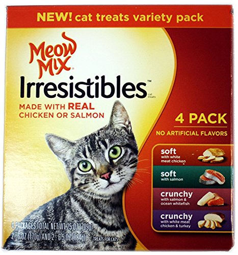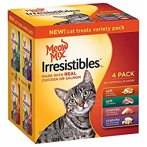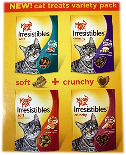 Now you can get closer to your cat any time with a tasty little treat! Meow Mix Irresistibles are made with real chicken or salmon and no artificial flavors, so you can feel good about treating. This variety pack includes crunchy and soft varieties for tastes and textures your cat will love.