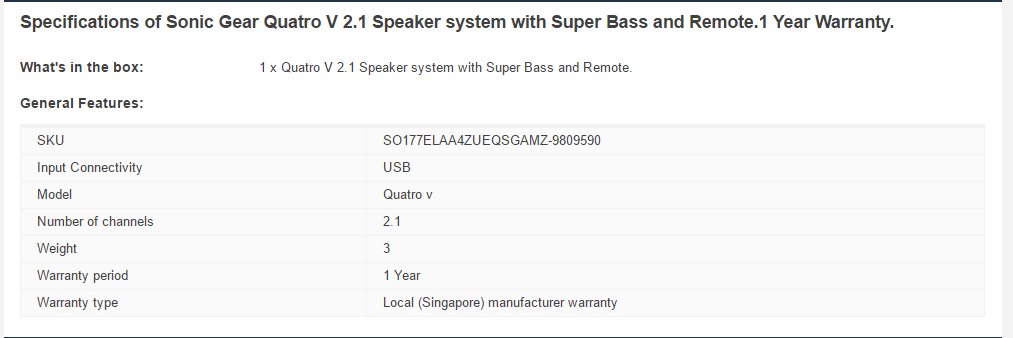 The SonicGear Quatro V is a USB powered system with Super Bass with dual SonicGear bass reflex panel. It comes with a wireless remote control and control panel with buttons for input made and music playback function.u0026nbsp;
