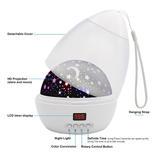 -. Feature : *SurP.R.Ised Gift:Can Rotate Automatically Cute Egg Shape Night Light With Timer Auto Shut-Off Which Projects A Night Sky Of Moon And Stars On Your Ceiling Or Walls.It's Good For Arousing Curiosity In Baby For Universe And Astronomical Science.This Great Night Light Is Ideal For Kids Children Scared Of The Dark At Bedtime. / *Button Control:5 Buttons On The Night Light.A Show Steady Warm White Light, B Color Changing Switch,C Rotary Control Button. D Sets The Time From 5-995Min, When The Time Is End,It Will Turn Off Automatically.It Would Not Disturb Your Sleep Anytime. / *Power Supply Method:4xAAA Batteries(Not Included) Or Connect With Usb Cable to Plug In Your Computer,Laptop,USB Converter,Power Bank,Please Note That Usb Cable And Batteries Can Not Be Used At The Same Time; / *Show Light Color:4 LED Bulbs(Red, Green, Blue, White) Are Brighter Than The Old One. Also It Has A Much Wider Projection Range. And It Makes Your Baby Eyes Feel Soothing Not Glare; / *Easy To Use:Take Off The White Cover,Star And Moon Will Be Projected To Every Corner Of The Wall Clearly,Be Suitabled For Party, Birthday, Wedding And Home Decoration, Take On The White Cover Also Can Put In The Bedroom And It Will Be Make You Relax Until Sleep,It Can Be As A Table Lamp When You Remove The Star Cover And Then Put On The White Cover To Use Directly.