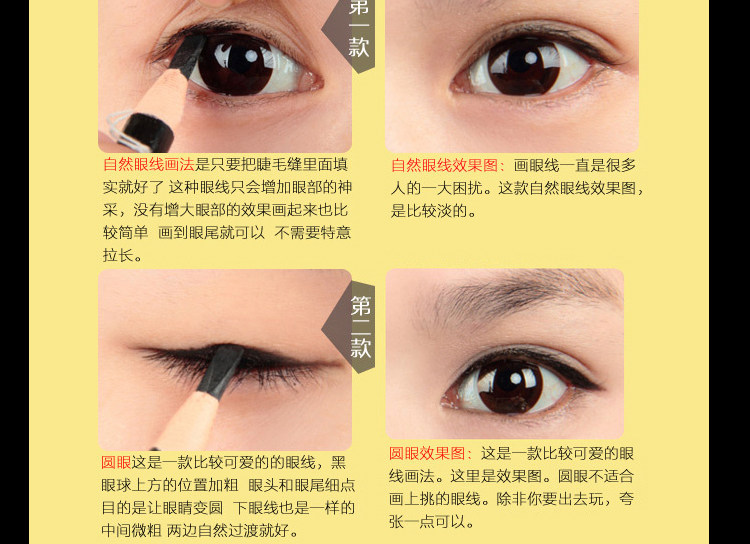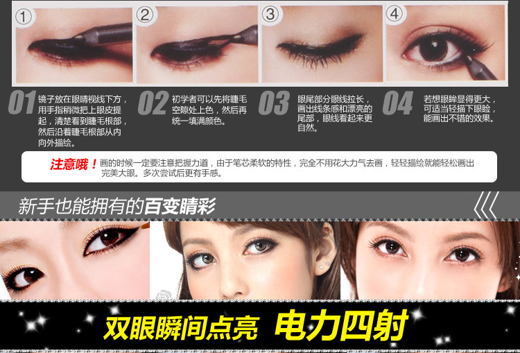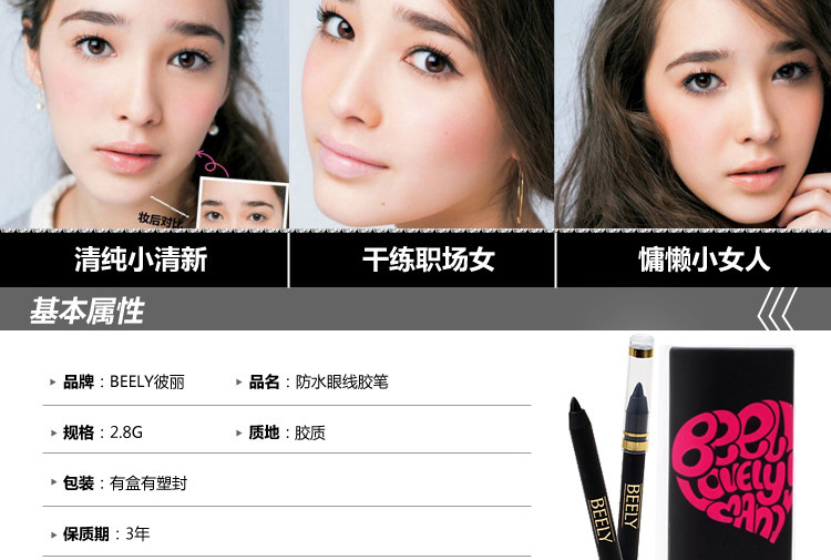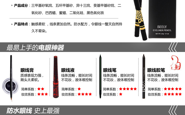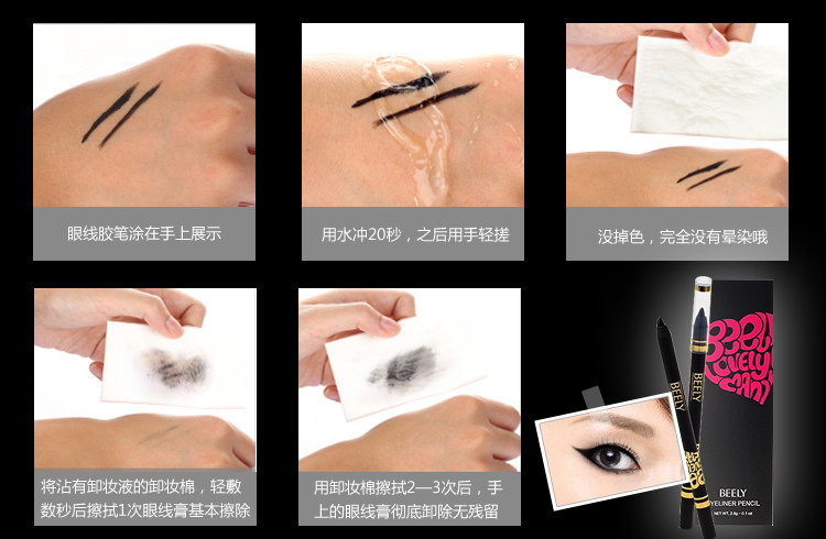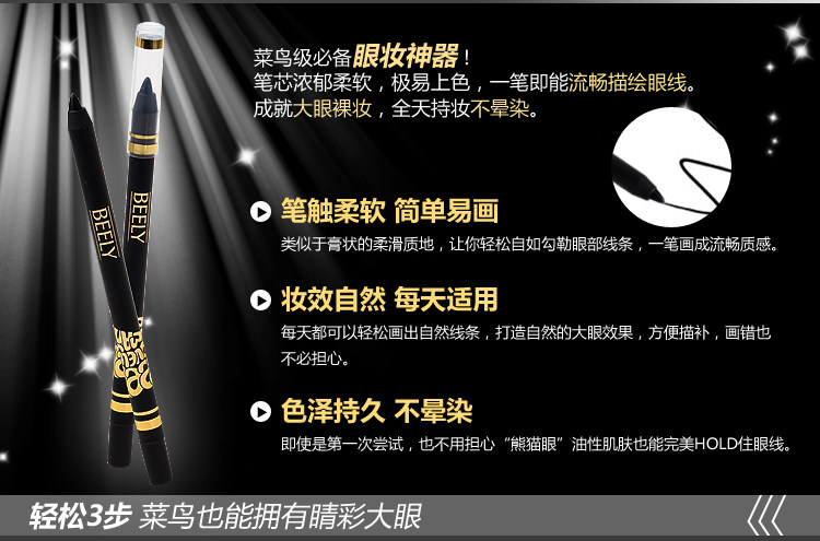 Features: soft touch, more natural lines. Waterproof formula, so naturally all day lasting eyeliner is not blooming