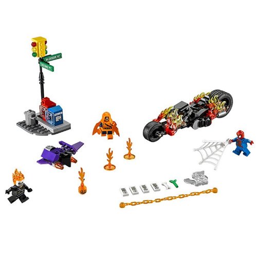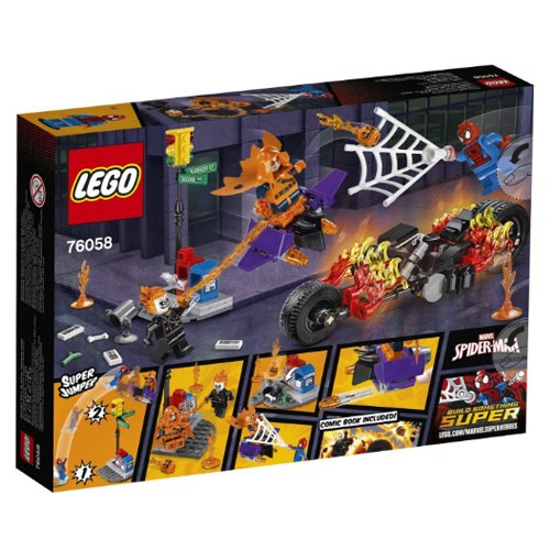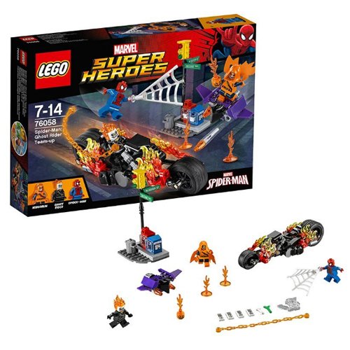 -. Binding : Toy -. Brand : L.E.G.O -. EAN : 0732235196639 -. Feature : Includes 3 minifigures: Spider-Man, Hobgoblin and Ghost Rider. / Features a Ghost Rider Bike, Goblin Glider and traffic light model. / Ghost Rider Bike features turning wheels, fire elements and a saddle. / Goblin Glider has 2 flick missiles. / Place the Goblin Glider on top of the traffic lights, and activate Spider-Man's Super Jumper power to reach the Hobgoblin. -. IsAdultProduct : 0 -. Label : L.E.G.O -. Manufacturer : L.E.G.O -. ProductGroup : Toy -. ProductTypeName : TOYS_AND_GAMES -. Publisher : L.E.G.O -. Studio : L.E.G.O -. Title : L.E.G.O 76058 Super Heroes Spider-Man Ghost Rider Team-up Construction Set -. UPC : 732235196639