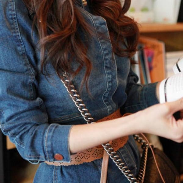 オシャレなウエストベルト付 Aライン デニムワンピース ミニ/M