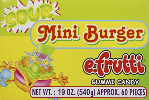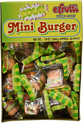 -. Feature : Each order has 60 individually wrapped gummi sour burgers / Delicious Sour Gummi Hamburgers. 60 individually wrapped pieces per box. / E-Fruitti Sour Gummi Burgers (60 ct) / Great for pinata stuffers and novelty gift giveaways