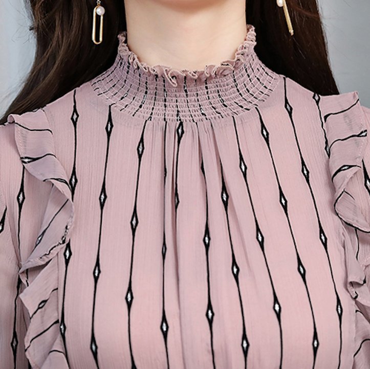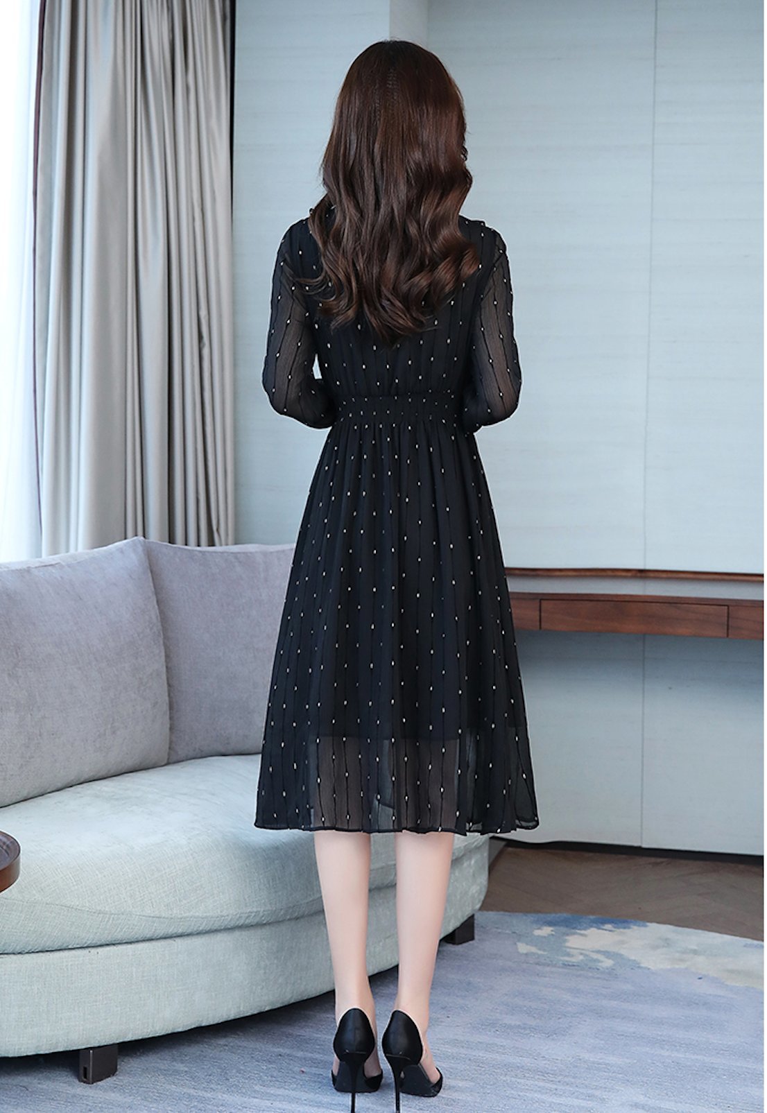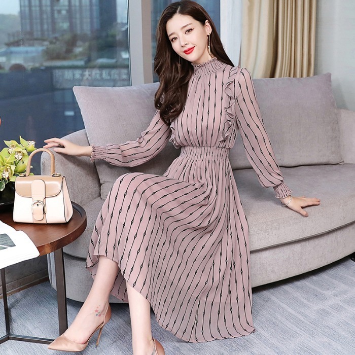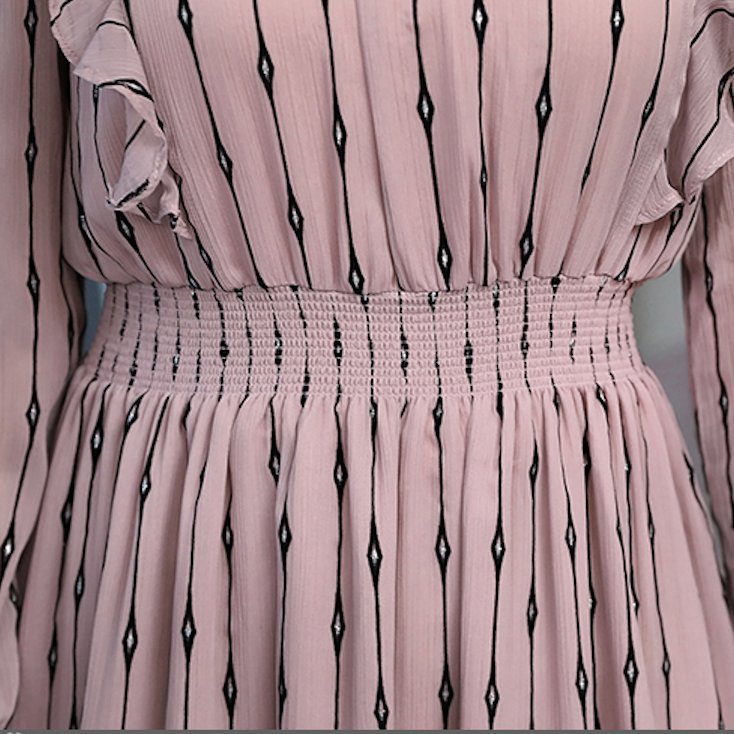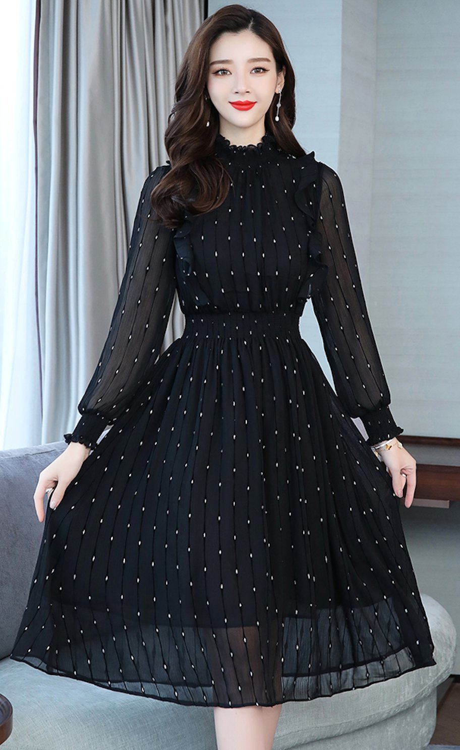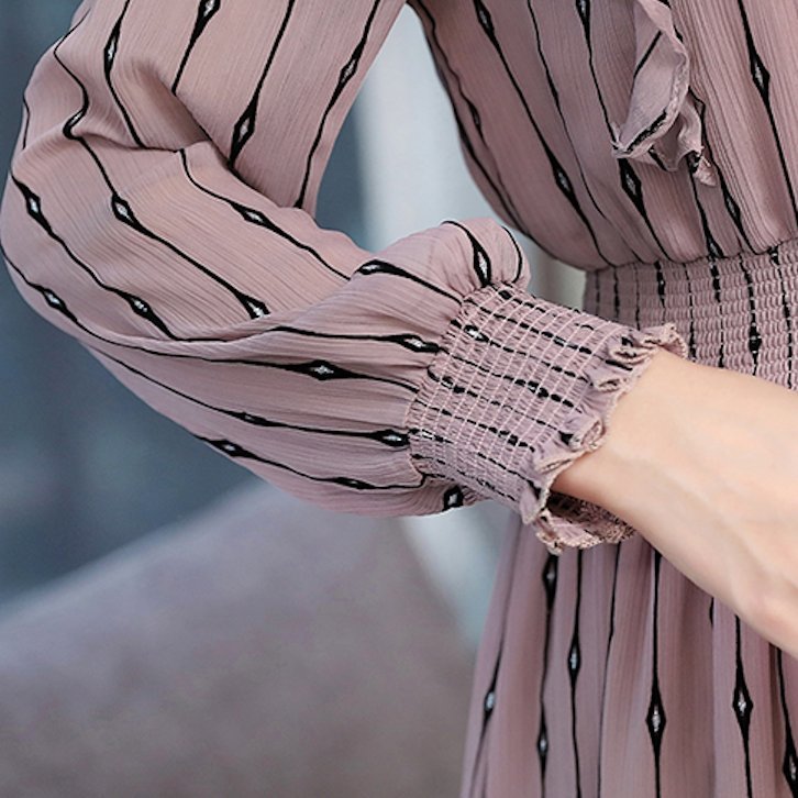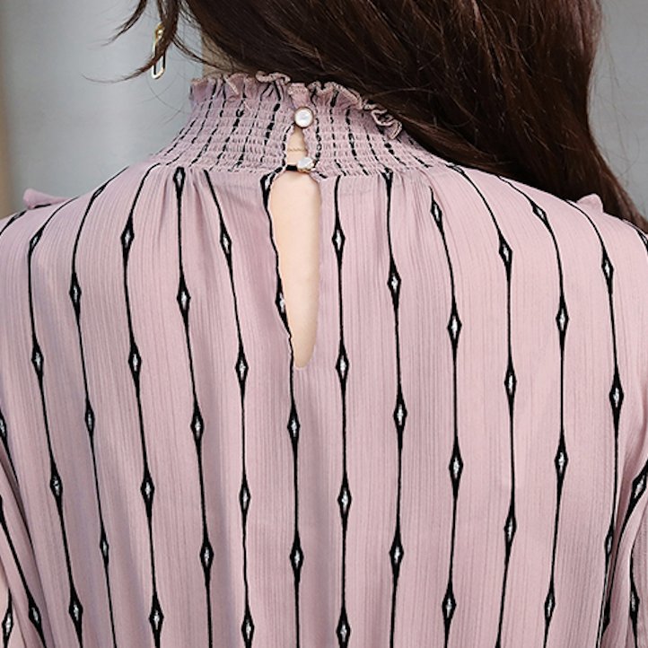 ストライプ柄風 ハイネック パフスリーブ フレア ワンピース ドレス シフォン 絞り ドット柄 透け感 シースルー パーティー お呼ばれ きれいめ