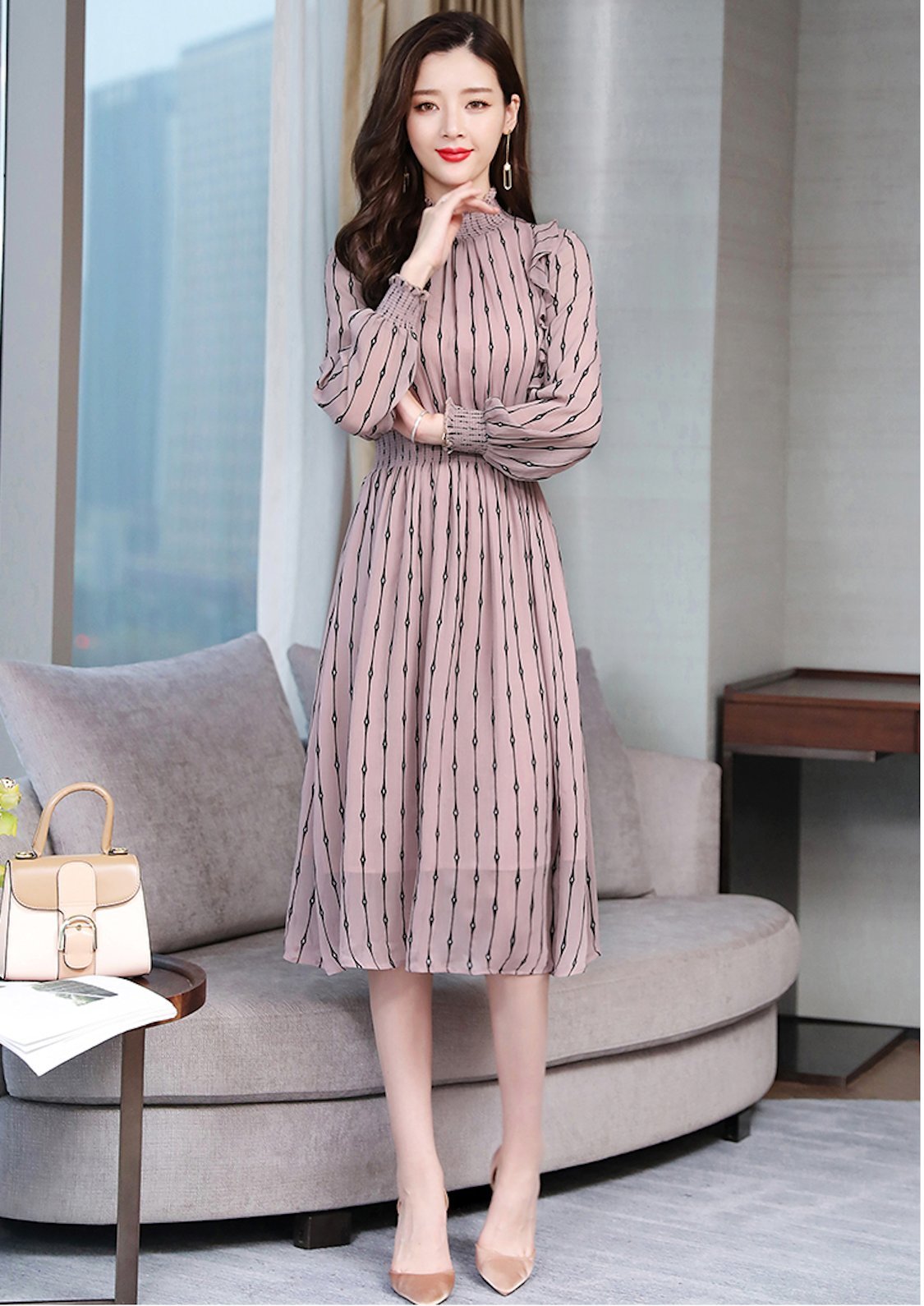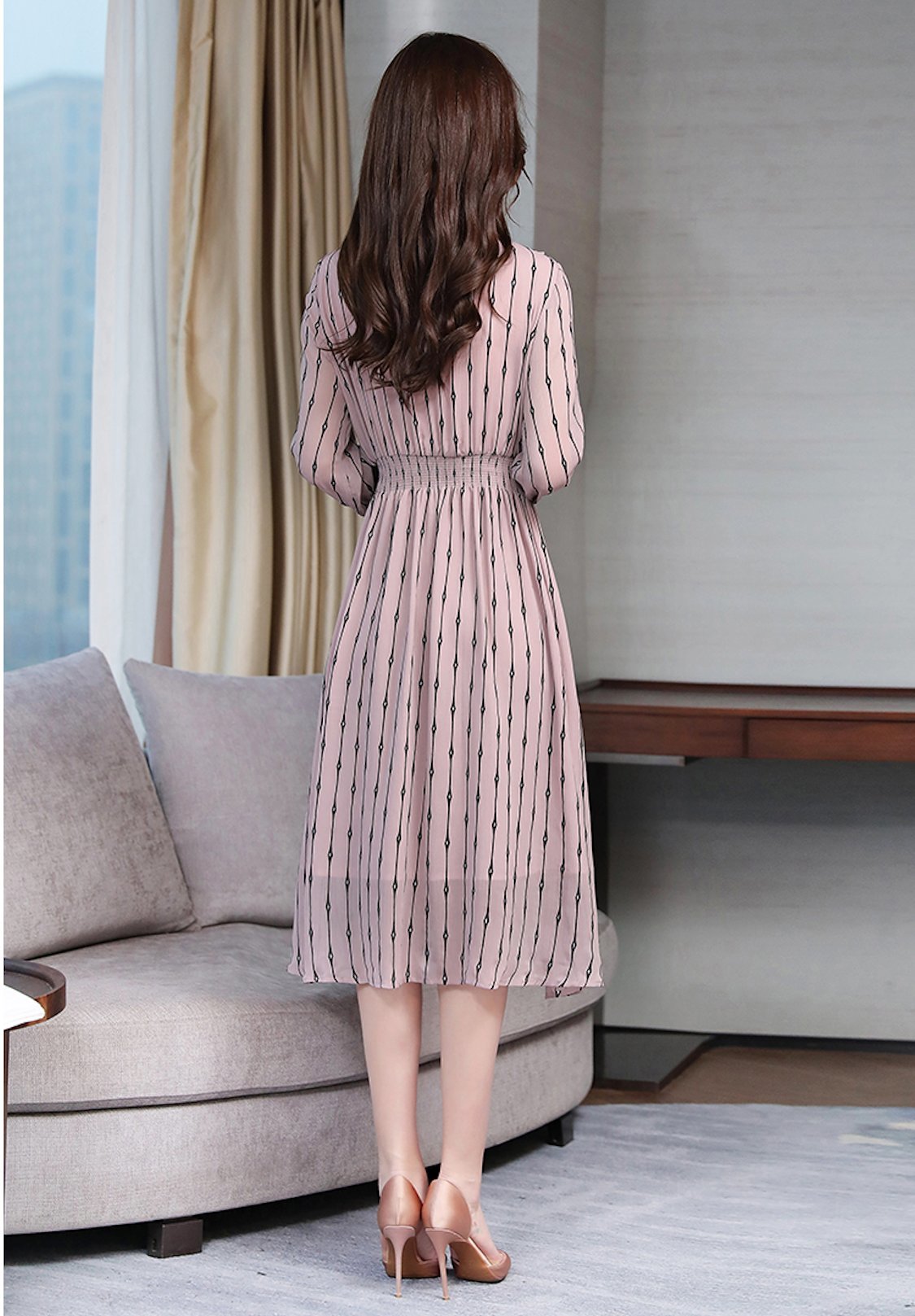 ふんわりシフォン素材のミモレ丈ワンピースドレス。