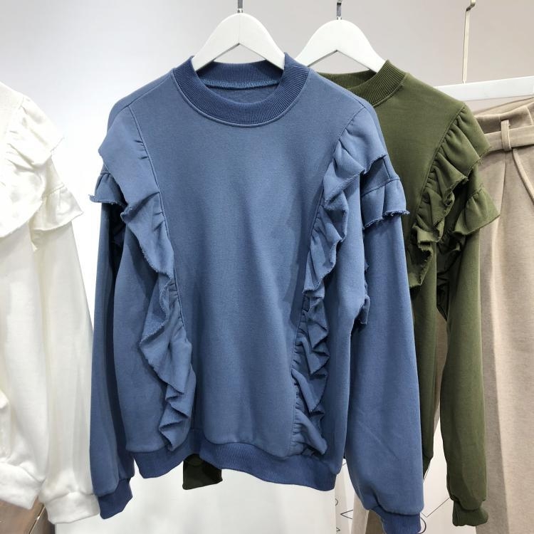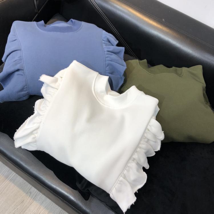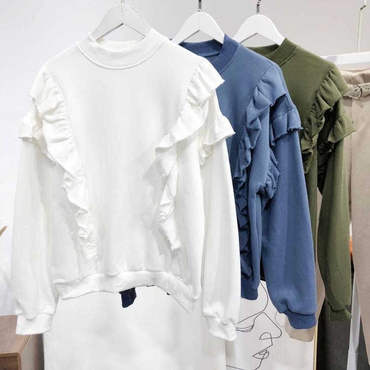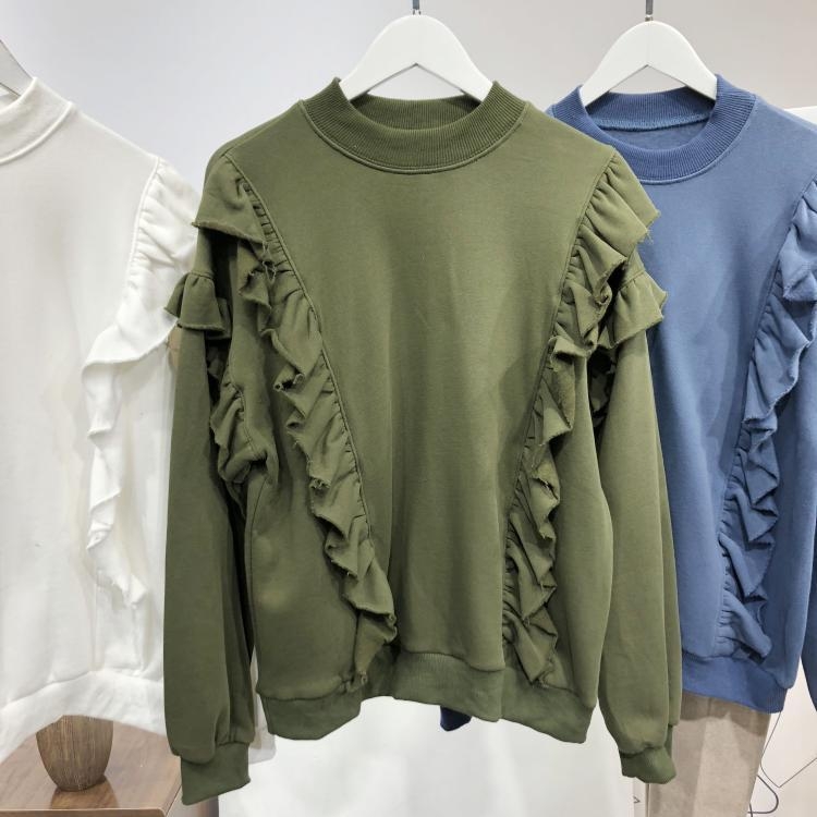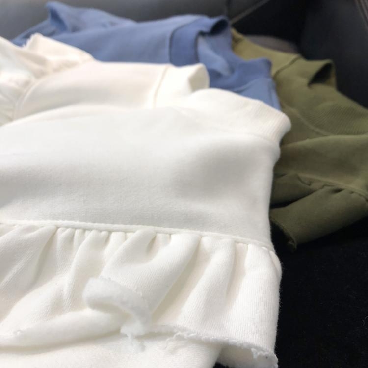 裏起毛スウェットですがカジュアル過ぎず、フリルで可愛さもあるシンプルな一枚!