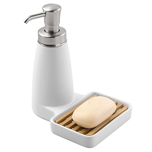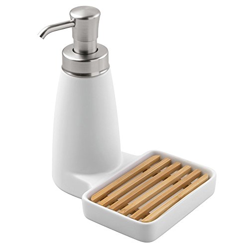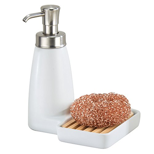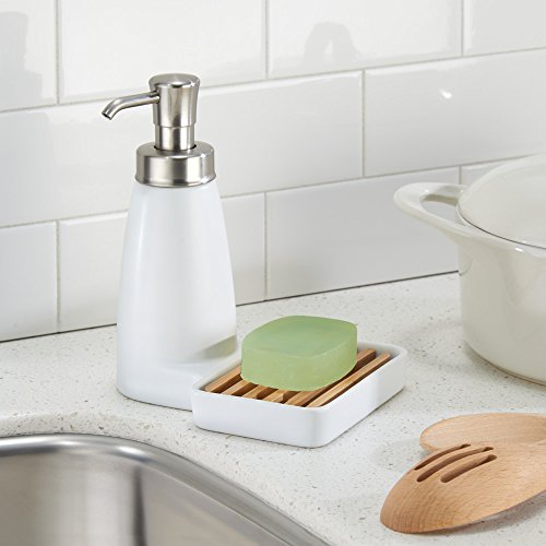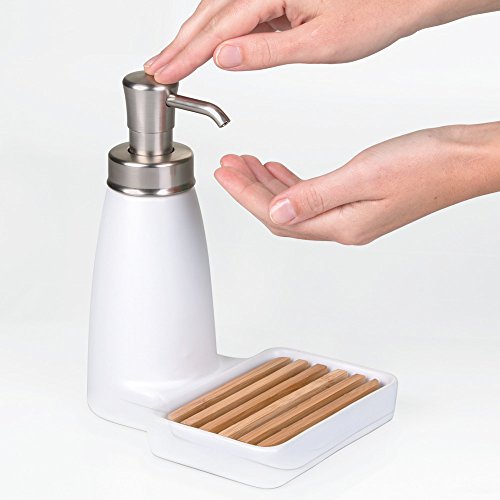 InterDesign Benton Soap Dispenser Pump with Sponge Tray Organizer for Kitchen Countertops - White/Natural/Brushed