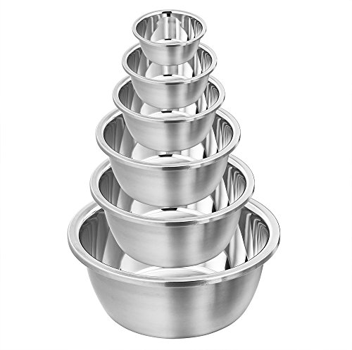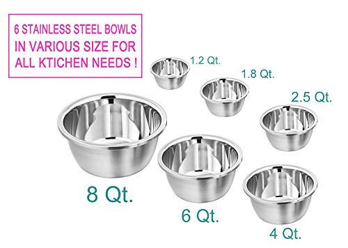 6 ESSENTIAL SIZE - Various size from large to small, 1.2 - 1.8 - 2.5 - 4 - 6 and 8 quart; This mixing bowl set allows users to be well equipped for mixing stuffs, adding ingredients for dessert, marinating for the grill, serving fruit salads, etc