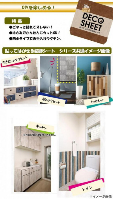 | のり残りなしではがせる日本製の装飾シートです。貼りやすい大きさにカットして使用できます。防水性に優れているので、キッチンや床、壁など自分好みに変えたいという方におすすめです!! |