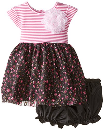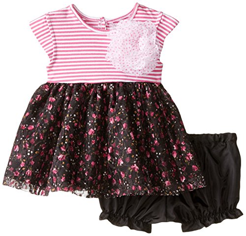 Pink and white striped jersey knit is paired with a floral mesh layered skirt and accented with a floral applique
