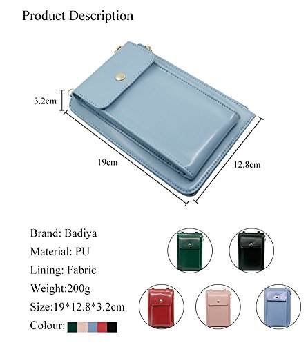 -. Feature : Badiya crossbody phone purse design with superior synthetic leather(have not any smell), which is ECO-Friendly,durable and soft. Purse Size: 7.41"¡Á4.99"¡Á1.25", Wristlet length 19.8cm, Shoulder strap 122cm. / Phone crossbody bag Snug and secure fit, never go digging for your phone in the bottom of your bag.Never again will your iPhone/smartphone fall out of your back jeans pocket. / This stylish Phone purse holder perfect size to fit the smart mobile phones with a screen size of 5.5 inch and below,such as Apple iPhone 7 6S 6S PLUS 6 5S,Samsung Galaxy S3,S4,S5,S6,S7 and other cell phones with thin case only. / Cross body bags versatile Use with adjustable & detachable shoulder strap and wristlet, can be as a wristlet purse or crossbody bag; The strap makes it a fashionable, stylish and novelty wrist purse,clutch handbag / Small cross body purse ideal option for outdoor use (walking,camping,shopping etc) and travel,daily life use as well.Fashionable,practical and multi-function design and comfortable to wear.It's also a great idea as a small birthday gifts for women / present for the one your love.