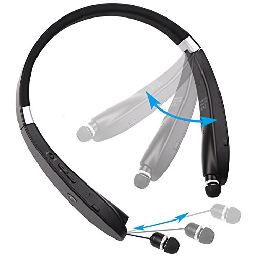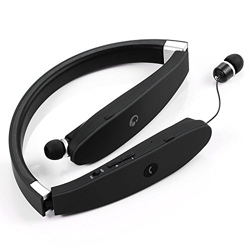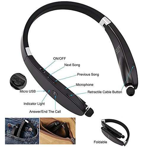 Distinctive foldable design--The bluetooth headset foldable design provides amazing flexibility, portability, and durability. No need to worry the headset will be break off when you put it in your bag. Just one press to retract the earbuds. The headset cable can be adjust to the best length