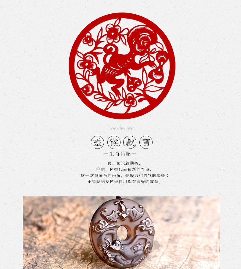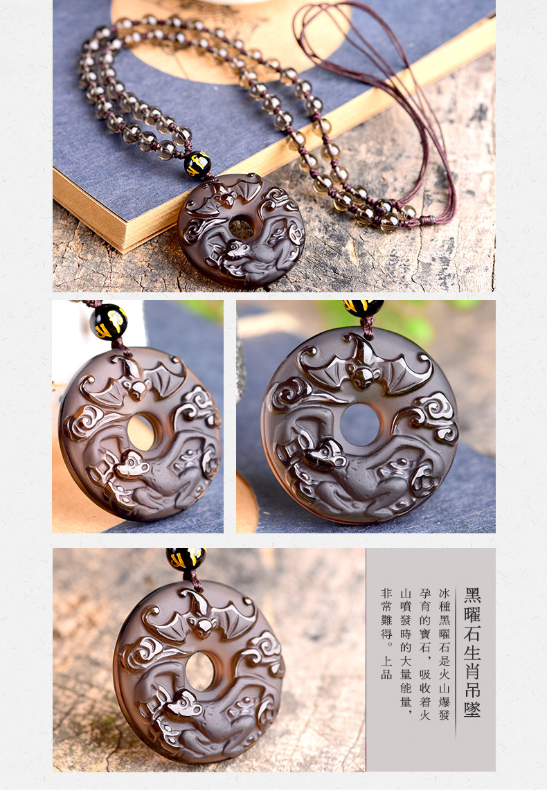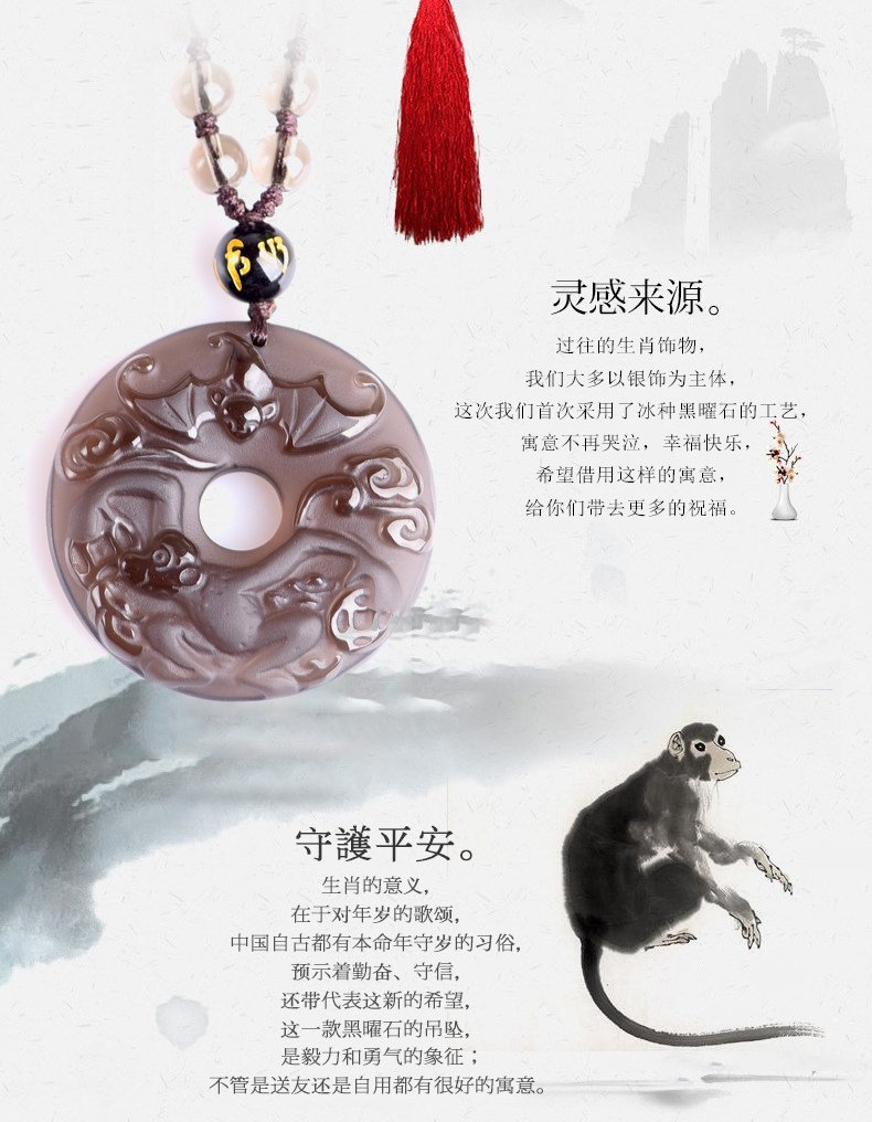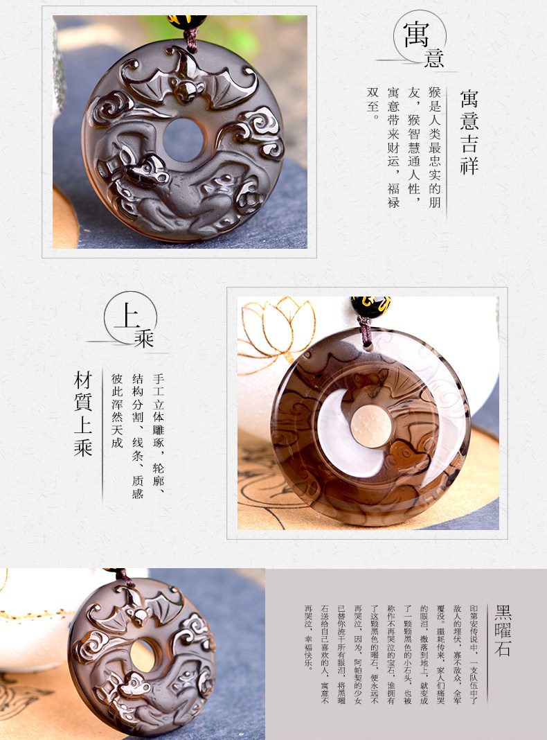 开光天然冰种黑曜石吊坠 十二生肖属猴男女款平安扣项链水晶饰品