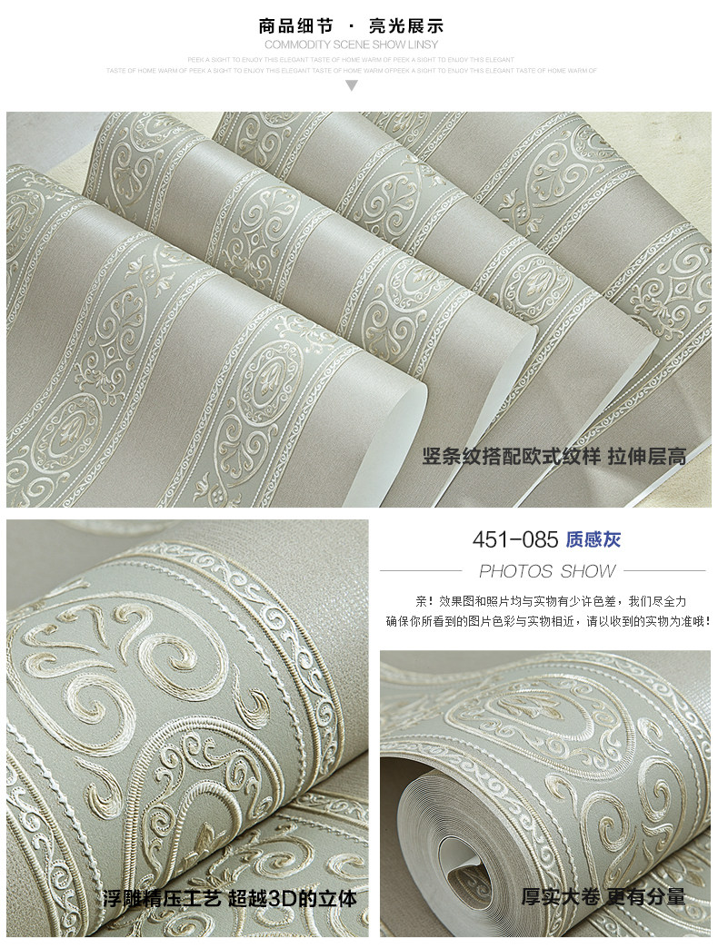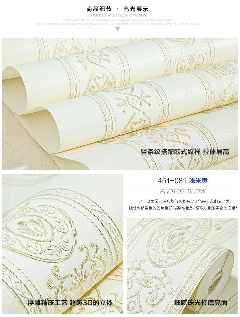 Brand: Royal family paper Each roll width (m): 0.53 Roll length (m): 10 Denominated: Volume 1 Style: European Surface layer process: embossed Wallpaper Size: 5.3㎡ / roll Material: Non-woven, non-adhesive, accessories to buy another Due to lighting and other reasons, it is inevitable color, please prevail in kind