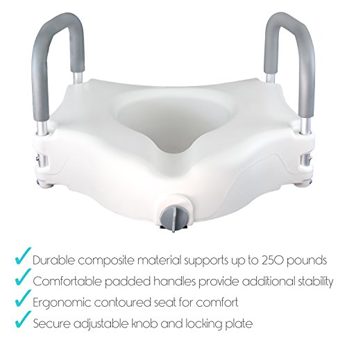 SAFE: Durable heavy duty plastic supports up to 250 lb weight capacity. Padded Handles for extra stability and security. Locking plate ensures secure fit to toilet bowl.