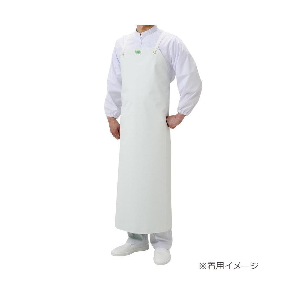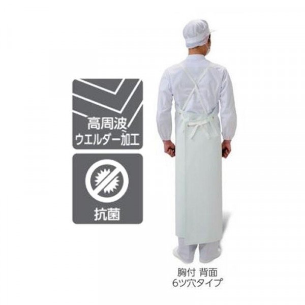 抗菌剤配合の素材を使用した前掛。専用の機械によって加工されており、縫目(ミシン目)のない作りになっています。縫目への汚れ溜まりやミシン糸のほつれがなく食品製造などに最適です。 |