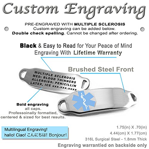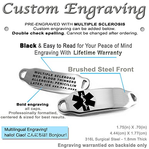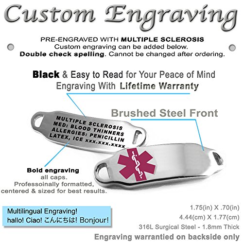 -. Binding : Jewelry -. Brand : My Identity Doctor -. Department : womens -. Feature : SIZING: Measure wrist around smallest part slightly snug. Order the size you measured (or larger, sizing down is easier). Your item will arrive to fit the wrist size ordered with room for comfort. / Womens alert bracelet engraved with - Multiple Sclerosis - BLACK engraving recommended for your safety (see photos) / LIFETIME WARRANTY on engraving warrantied directly from My Identity Doctor / Top quality 316L hypoallergenic steel, non corrosive and will not tarnish / Medical ID bracelet can be adjusted with proper tools - extra links are also provided -. Label : My Identity Doctor -. Manufacturer : My Identity Doctor -. Model : i2C-YR11(MULTIPLE-SCLEROSIS) -. MPN : i2C-YR11(MULTIPLE-SCLEROSIS) -. PartNumber : i2C-YR11(MULTIPLE-SCLEROSIS) -. ProductGroup : Jewelry -. ProductTypeName : FASHIONNECKLACEBRACELETANKLET -. Publisher : My Identity Doctor -. Studio : My Identity Doctor -. Title : MyIDDr - Engraved Multiple Sclerosis MS Bracelet, Red Millefiori Glass
