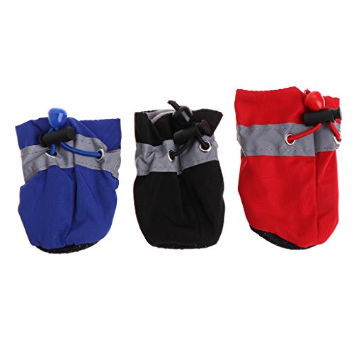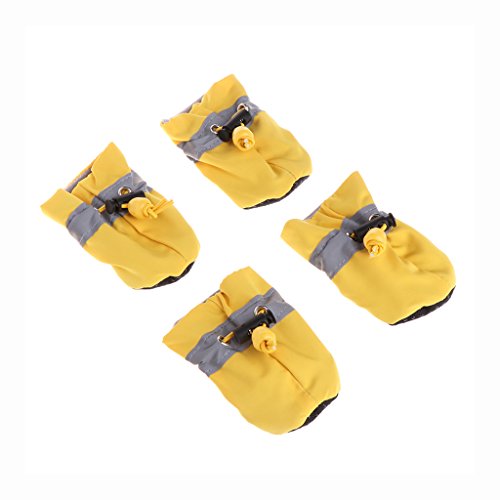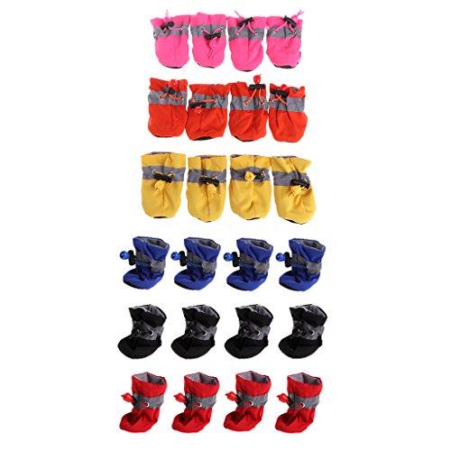 -. Feature : Material: Waterproof cloth. / Color: Blue/Red/Black/Yelloe/Pink/Orange. / Quantity: 1 Set (4 Pcs) .Material: Waterproof cloth, rubber bottom, adjustable velcro snap. / Dog Waterproof shoes,do not proof heavy rain, it is better to wear it indoors and room. / Perfect for everyday wear,holiday,parties,and photos,Protect your little baby to play happily,keep him/she stylish and cute.