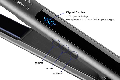 Feature : Tourmaline ceramic floating plates, Straighen, Flip and Curl your hair. Create a shinier, silkier finish in lesser time. / 450F High Heat - Digital display adjustable temperature from 265F to 450F (130C - 230C) to suit all hair types. / Heat Fast - Advanced Metal Ceramics Heater technology 30-second heat up and 60 mins auto shut off. / 360 degree salon model swivel cord (10 ft.) / 2 year warranty