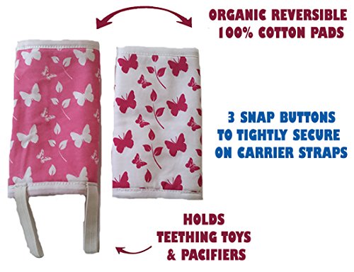 WILL STAY IN PLACE: Loops (At the top) and button holes (at the bottom) of the center piece help in securing the pad to carrier and prevent from flip-flop while getting baby IN-and-OUT as observed with others products. Shoulder pads have 2 hanging elastic straps to attach teethers, pacifiers, toys & more.