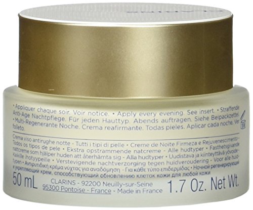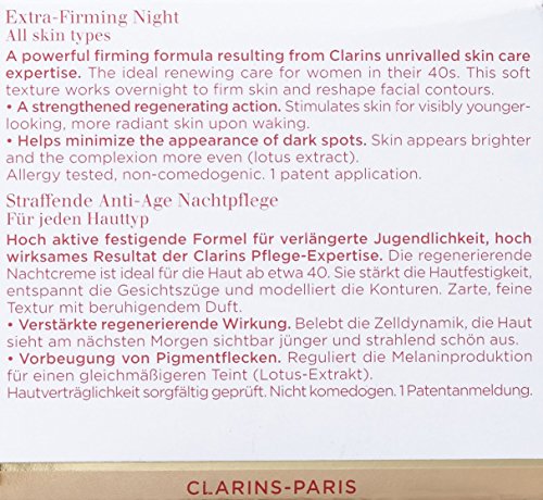 -. Binding : Health and Beauty -. Brand : Clarins -. Department : womens -. EAN : 0640034219179 -. Feature : These items are great for personal use but may not be great as gifts / This product is easy to use / This is high quality product, made of high quality material / Delivers cool, all-day moisture while eliminating shine brought on by blazing heat and humidity / It creates a protective micro-environment that shields skin from hot weather, pollution and environmental extremes / It is recommended for casual wear -. IsAdultProduct : 0 -. Label : Clarins -. Manufacturer : Clarins -. Model : U-SC-1610 -. MPN : U-SC-1610 -. NumberOfItems : 1 -. PackageQuantity : 1 -. PartNumber : U-SC-1610 -. ProductGroup : Beauty -. ProductTypeName : BEAUTY -. PublicationDate : 2014-04-26 -. Publisher : Clarins -. ReleaseDate : 2014-04-16 -. Size : 1.7 oz -. SKU : 37938_-50ml -. Studio : Clarins -. Title : CLARINS Extra-Firming Night Cream, 1.7 Ounce -. UPC : 640034219179