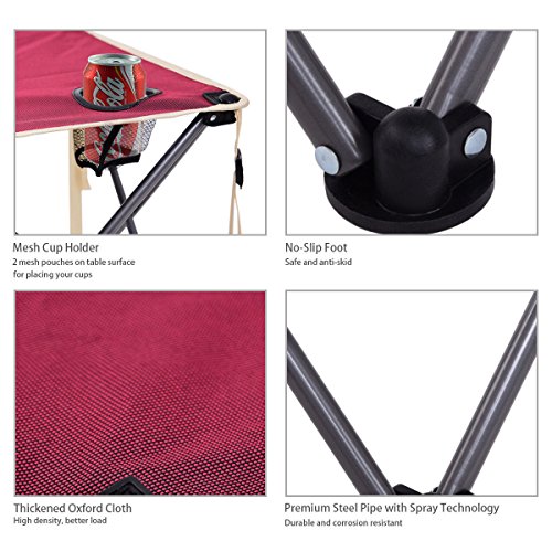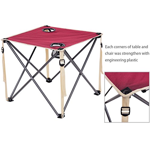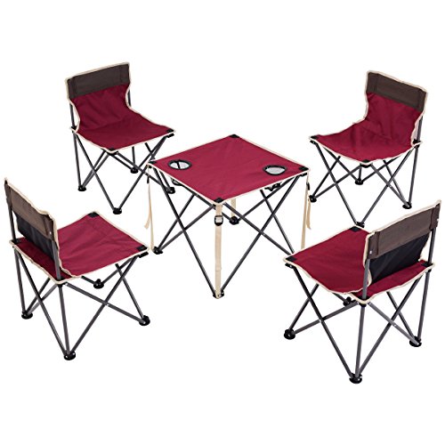 Studio : by Azaleahome Publisher : by Azaleahome Product Description This is our brand new portable camping table and chair set. It can be easily installed, folded up and finally can be readily carry. It doesn't take up too much energy(only 12lbs) when you carry it by yourself. What's more, it's convenient to transport as well. Lightweight, portable and durable is perfect for indoor and outdoor activities, such as the beach, barbecue, backyard party, outdoor concert, camping, hiking and so on. Furthermore, even if there is a large number of people in your party, you still can have a wonderful time with your friends or family .Unfolding Dimensions doesn't take up too much space, and it even can be put into a bag which is more convenient for you. Specification Color: Red Material: Steel , ABS, Oxford Cloth Overall Dimension(Fold):25.6"×9.1"×9.1" (LXWXH) Chair Dimension:15"x15"x23.2"(LXWXH) Table Dimension:19"x19"x17"(LXWXH) Table Weight Capacity: 33Lbs Chair Weight Capacity:245Lbs Weight:12 Lbs Package Includes: 1× Table 4× Chair 1x Bag 0