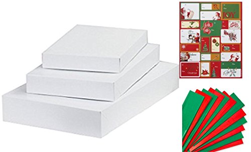 White Christmas Gift Box Wrapping Kit- 10 White Gift Boxes, 24 Red/Green Tissue Paper, and 20 Gift Tag Stickers