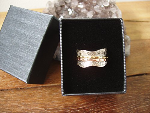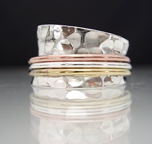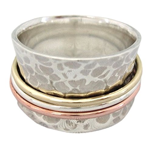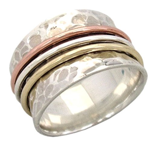 -. Binding : Jewelry -. Brand : Energy Stone -. Department : womens -. Feature : SERENITY / Meditation spinning ring handcrafted by Indian artisan for Energy Stone / Beautiful hammered pattern sterling silver base shank with 3 outer spinners in silver, brass and pink copper / Elegant and rich looking -- 12 gram of silver / Ring tappers in the back for comfortable wear -. Label : Energy Stone -. Manufacturer : Energy Stone -. Model : US12 -. MPN : US12 -. PartNumber : US12 -. ProductGroup : Jewelry -. ProductTypeName : FASHIONRING -. Publisher : Energy Stone -. Studio : Energy Stone -. Title : Energy Stone "SERENITY" Tapered Band Tri-Color Spinners Sterling Silver Meditation Ring (Style# US12)