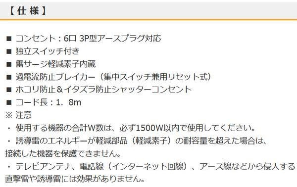 3P型のアース付きプラグに対応しています。丈夫な二重被ふくコード。絶縁カバー付きL型プラグです。 生産国:中国 ※サプライヤー直送品 ご注文後3~4営業日後の出荷となります【商品名】OHM アース&雷ガード/3Pプラグ対応 個別スイッチ付き 節電タップ 6個口 1.8m HS-T1259W