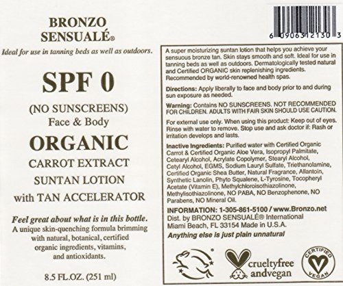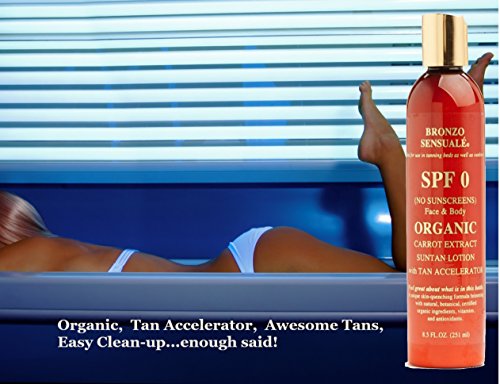 Skin-soothing, Certified Organic, oil-free carrot lotion for a healthy looking tan. Contains NO sunscreens and is ideal for use in tanning beds. This is NOT a self-tanner nor a bronzer. Natural ingredients provide deep penetrating moisturizers to your face and body without clogging pores.