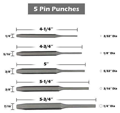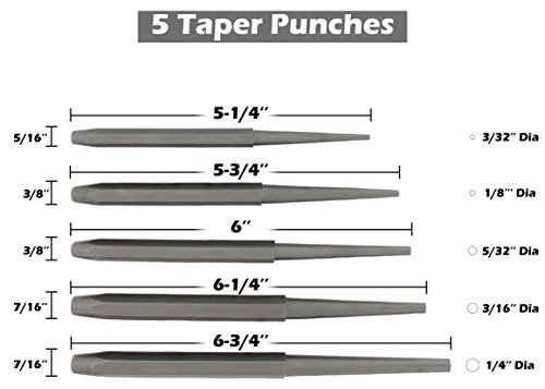 ✓ SPECS: 16 PC Kit Includes: 5 Pin Punches – 5 Taper Punches – 3 Cold Punches - 2 Center Punches – 1 Chisel-Punch Gauge | Sizes are carved onto each Punch/Chisel for easy identification - Please refer to Description below for detailed Product Dimensions.