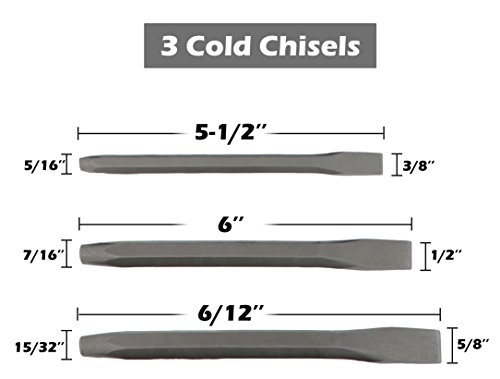✓ USE FOR: The Must-Have Kit for Metal Working Mechanics | ‘Pin Punch’ is used to remove pins from holes – ‘Taper Punches’ is used to punch & align holes – ‘Cold Chisels’ is used for splitting rusted nuts and Blacksmithing Metal – ‘Center Punches’ makes dimples in cold metals to prevent drill ‘wandering’ - ‘Punch/Chisel Gauge’ used to measure and check the tools ends.
