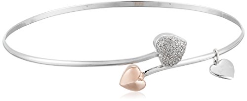Sterling silver bypass bangle tipped with diamond-set heart and puffy rose gold-plated heart at alternate ends