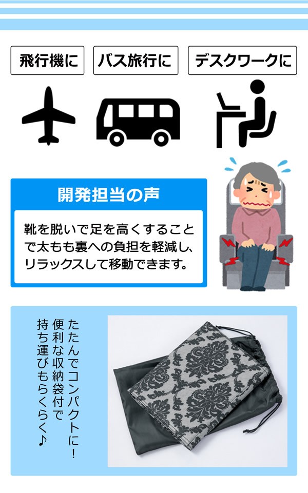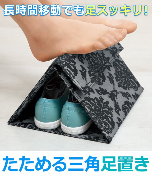 | ずっと同じ姿勢で座っていると、足が痛い・・・。そんな方にぴったりの足置きが登場!靴を脱いで足を高くすることで太もも裏への負担を軽減し、リラックスして移動できます。飛行機やバスの長時間移動はもちろん、デスクワークにも!コンパクトにたたんで持ち運べるので便利です。さらに、三角の空きスペースに靴を収納できるのでスペース広々! |