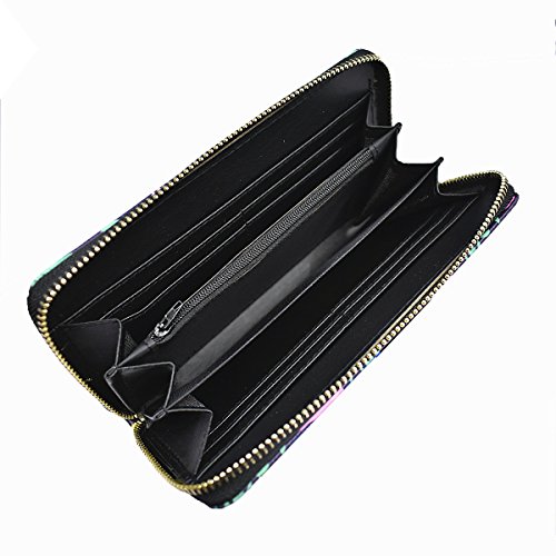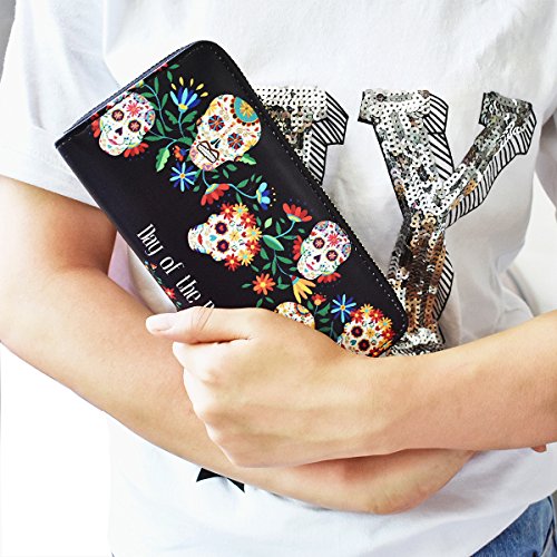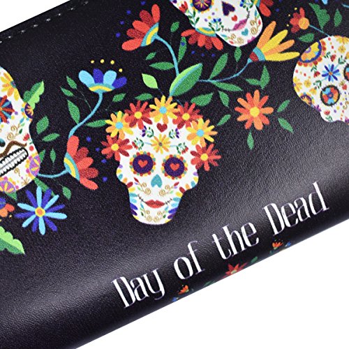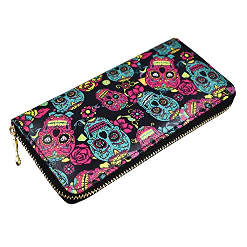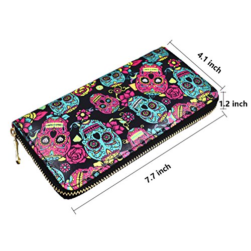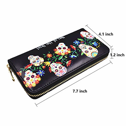-. Feature : Soft smooth PU leather Wallet with fabric lining, metal zipper section easy for opening / Unique Skull elements P.R.Inted designer purse / Proper Size for Hand-holding / Large capacity for ID card, cash, name cards, and 8 cards, and also cellphone / Gift for Halloween