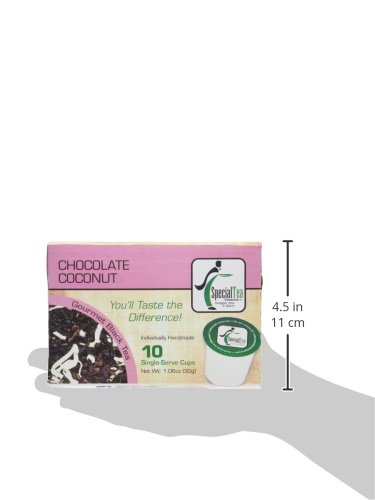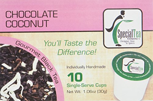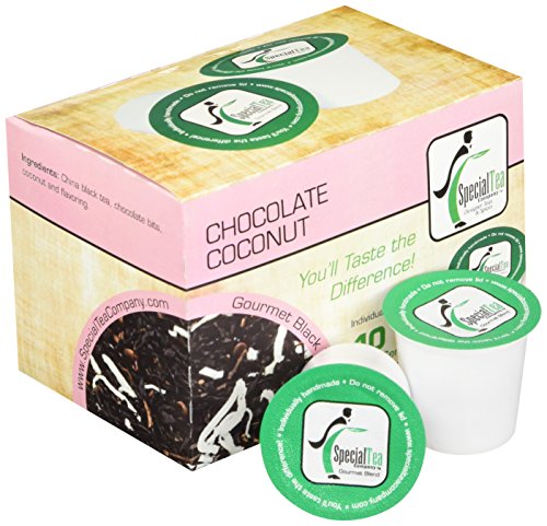 -. Binding : Grocery -. Brand : Special Tea -. EAN : 0683422479717 -. Feature : China black tea, chocolate bits, coconut and flavoring / Compatible with Keurig K-cup brewers and other single serve brewers, not compatible with Keurig vue or rivo / Brew two cups from a single cup / Convenient for busy mornings or an on-the-go treat / Handmade single serve tea cup -. Label : Special Tea Company -. Manufacturer : Special Tea Company -. MPN : 683422479717 -. NumberOfItems : 1 -. PackageQuantity : 1 -. PartNumber : 683422479717 -. ProductGroup : Grocery -. ProductTypeName : GROCERY -. PublicationDate : 2015-06-23 -. Publisher : Special Tea Company -. ReleaseDate : 2015-06-23 -. Size : 30 Ounce -. Studio : Special Tea Company -. Title : Special Tea Chocolate Coconut Black Tea Single Serve Cups, 30 Gram -. UPC : 683422479717