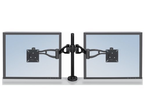 -. Binding : Office Product -. Brand : Fellowes -. Color : Black -. Department : mens -. EAN : 0080850250282 -. Feature : Two fully adjustable monitor arms for optimum viewing control / Easy to mount-clamp attaches to desktops 1"-3" thick or through grommet holes at least 3-1/4" in diameter / Elevates LCD monitors from 3-1/2" - 16-1/2" above the desk with a reach of 2-1/2" - 27" / Tilts up or down +/- 37° and freely swings left or right (360° rotation capability) / Each arm holds a monitor up to 24 lbs and meets VESA mounting standards -. IsAutographed : 0 -. IsMemorabilia : 0 -. Label : Fellowes -. LegalDisclaimer : Manufacturers warranty 90 Days or longer -. Manufacturer : Fellowes -. Model : 8041701 -. MPN : 8041701 -. NumberOfItems : 1 -. PackageQuantity : 1 -. PartNumber : 8041701 -. ProductGroup : Office Product -. ProductTypeName : OFFICE_PRODUCTS -. PublicationDate : 2011-10-20 -. Publisher : Fellowes -. Size : 20" - 23.9" -. Studio : Fellowes -. Title : Fellowes Adjustable Dual Monitor Arm (8041701) -. UPC : 163120606092 -. Warranty : 3 Year Limited Warranty