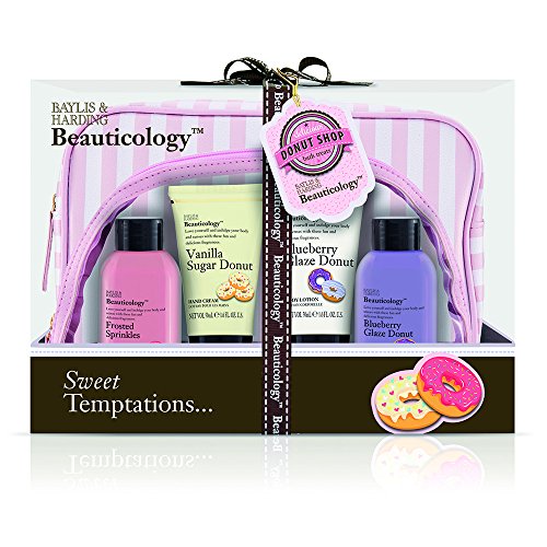 Baylis & Harding's Beauticology Donut Shop Cosmetics Bags Gift Set includes four of Baylis & Harding's most popular products plus two super cute cosmetics bags. A 100ml Frosted Sprinkles Body Wash will cleanse and revive tired skin and a 100ml Blueberry Glaze Donut Shower Crème gently envelopes the skin in a deliciously creamy layer of luxurious moisture. The Nylon Body Polisher helps buff and exfoliate any dry skin areas before the 50ml Blueberry Glaze Donut Body Lotion provides the finishing touch. For younger looking hands and healthy nails, there is a 50ml Vanilla Sugar Donut Hand Cream. This is a gift set packed with pampering perfection with its small pink and white striped cosmetic bag and larger matching toiletry bag. It is sure to delight all the sweet people in your life.Feature