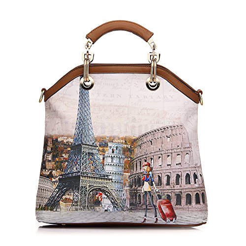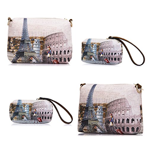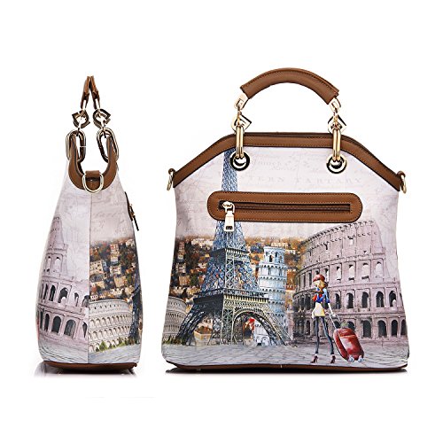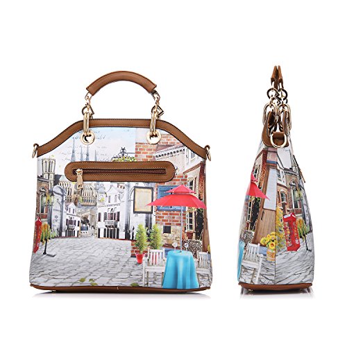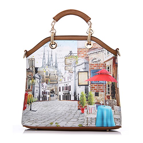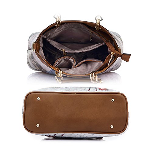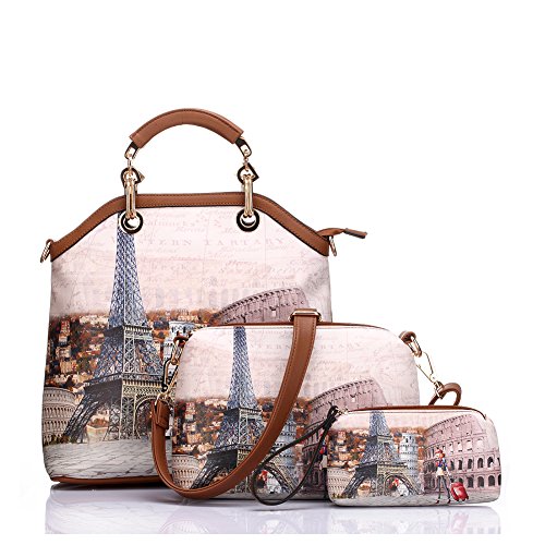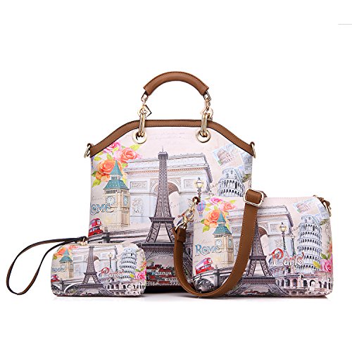 -. Feature : Ultra soft high quality synthetic leather with fabric lining. Top zipper closure. Modern gold-toned hardware. / Cartoon print Exterior composite bag, handbag back with zipper pocket.3PCS set handbag, cross body bag and purse. / Four metal 'feet' help protect the bottom of your bag; Adjustable and removable shoulder strap. / The inside has 1 main compartments with a center zipped piece,and one more zipper pocket and 2 open pockets for smart phone and keys/lipsticks. May hold A4 magazine, portable textbooks, wallet,umbrella . / 13.4" x 12.6" x 5.1"(WxHxD) handle drop: 3.1" message bag :9.4" x 7.5" x 2.8"(WxHxD) purse :6.3" x 3" x 1.6"(WxHxD)