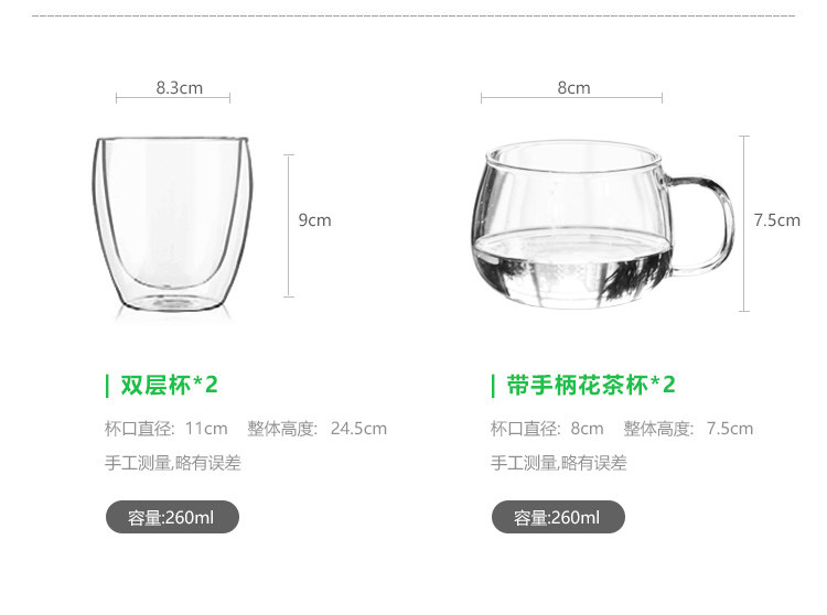 Double cup: high 9.0cm, cup diameter 8.3cm, capacity: 260ml