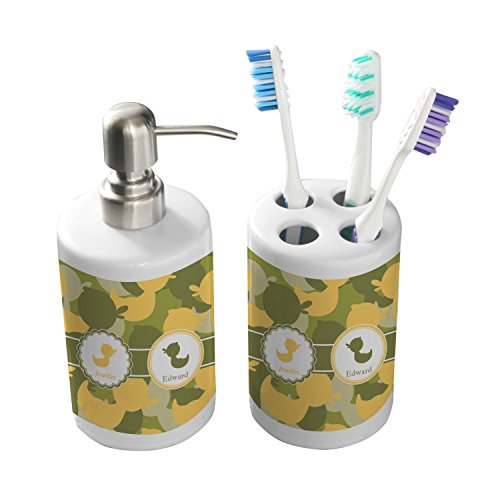 -. Brand : RNK Shops -. Color : Yellow -. Feature : YOU WILL RECEIVE AN EMAIL WITH A LINK TO CUSTOMIZE YOUR ORDER WITHIN 1 BUSINESS DAY / Custom P.R.Inted with Your Design / Easy to clean / 2 Piece Set -. Label : Mom Innovations -. Manufacturer : Mom Innovations -. MPN : cp-crmc-bthrm-acc+574323 -. PartNumber : cp-crmc-bthrm-acc+574323 -. ProductGroup : Home -. ProductTypeName : HOME_BED_AND_BATH -. Publisher : Mom Innovations -. Studio : Mom Innovations -. Title : Rubber Duckie Camo Bathroom Accessories Set (Ceramic) (Personalized)