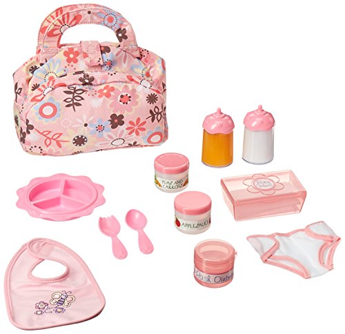 Young caregivers will love this complete set of gear to "parent" their baby dolls! Children can attach the bib and feed their babies with bottles, spoon, spork, divided dish, and two plastic pretend-food jars that really open and close . . . Then pull out the diaper bag to perform a quick change with the wipes, ointment, and diaper.
