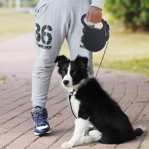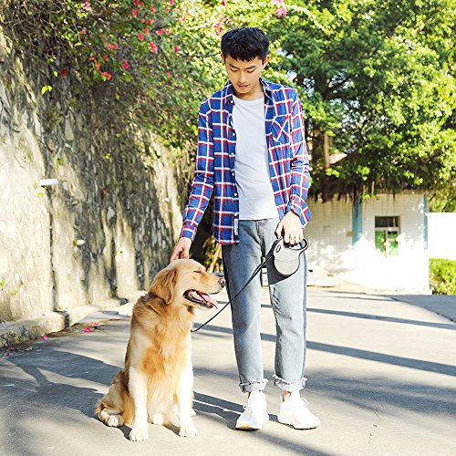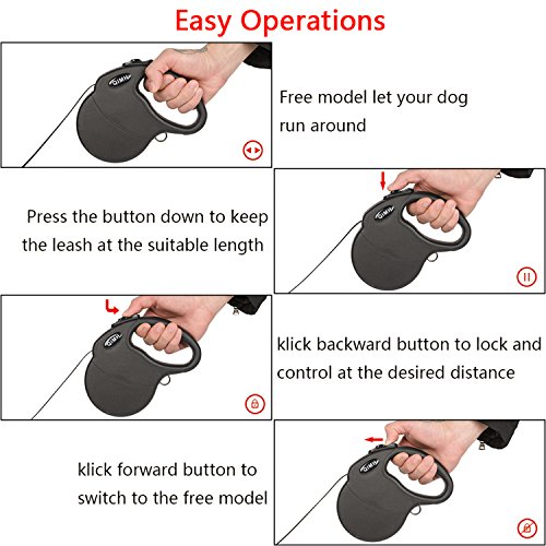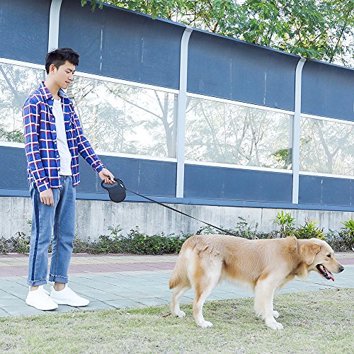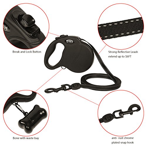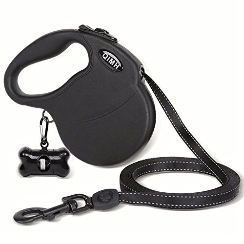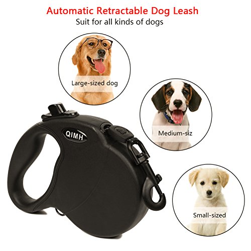 Specifications: Material: PP casing TPE anti-slip handle Polyester Leash Zinc Alloy Hook Size: Normal Maximum Tension: 110 lbs? Color: Black? Adjustable Length: 16ft Weight: 0.89pounds Dimensions: 7.2 x 5.4 x 1.4 inch (L x W x H)? Package Include: Retractable Dog Leash User Manual plastic bag bone-shaped cone ? Safety: The leash is made of thick nylon material, which is firm, smooth and can't jam. What's more,the rope is stitching that be stronger and durable. For the extension and shorten function of the retractable leash that you can immediately haul back your dog at your side when he is dangerous.The retractable leash is visible at night by refection light that give you and your dog safe environment. Firm Hook: ?The hook of the connecting part is quite firm and metallic luster. It is also anti-rust,anti-corrsion and can rotate 360 degrees. Hope you will have a nice purchase with QIMH retractable dog leash.If you own this heavy duty retactable dog leash, you will don't worry about our dog will out of your sight. 0 |