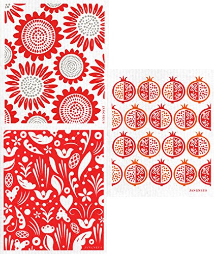 Swedish Dishcloth, (PP) Set of 3 RED Flowers & Pomegranate & Dala