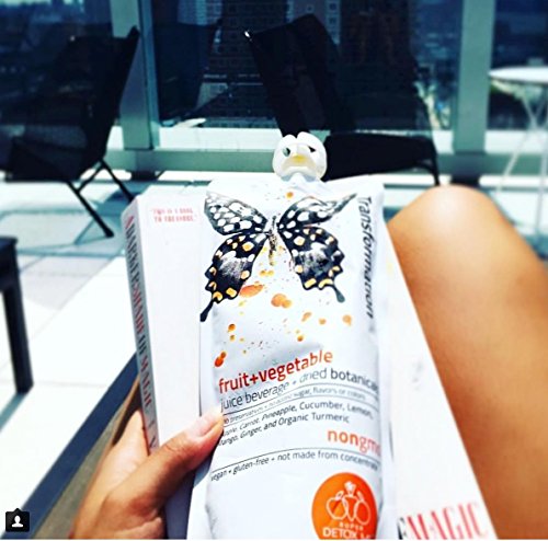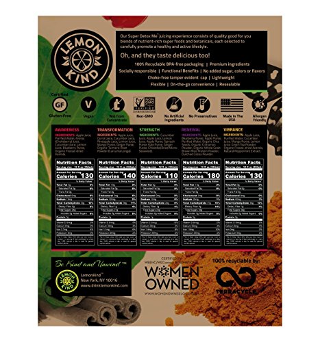 PREMIUM NUTRIENT-RICH INGREDIENTS: Green Tea, Organic Chia Seeds, Organic Cinnamon, Peppermint, Organic Acerola Cherry, Organic Turmeric Root, Chlorella, Organic Whole Grain Brown Rice Vegan Protein, Aronia Berries, Cucumbers, Lemons, Carrots, Apples, Spinach, Kale, Organic Ginger Root, Bananas, Blueberries, Unsweetened Cacao, Pineapples, and Alphonso Mangos. || THE SUPER DETOX ME EXPERIENCE: Each ONE DAY cleansing juice kit consists of eight (8) premium juices in 12 fluid ounce air barrier and aseptically sealed pouches which are neatly packed inside an ultra-light, and earth-friendly carry-on case. ||CLEANSE SMART: Each juice has been selected to carefully (1) Promote a healthy and active way of life, (2) Fire up metabolism and (3) Jump-start weight loss. Each Super Detox Me full body cleanse provides natural: 300% DV Vitamin A, 600% DV Vitamin C, 70% DV Iron and plenty of Dietary Soluble Fiber per day. ||OUR SUSTAINABLE IMPACT: We partnered with TerraCycle to create a free recycling program. Committed to our socially conscious mission, every pouch sent back in our prepaid envelopes will be turned into beautiful post-consumer recycled products. || OUR JUICE FOR LIFE SATISFACTION GUARANTEE: We value your business and want you to be happy with your purchase - Please notify us immediately if there is an issue with your order and we will do our best to resolve it quickly.Feature