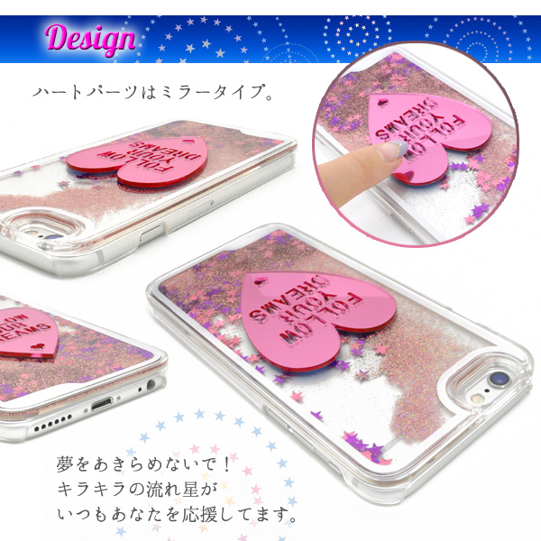 ラメがサラサラと流れて星空のように見えるケースに、ハートのプレートが映えるケースです。