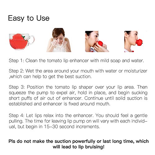 How to use it? STEP 1: Cleanthe tomato lip enhancer with mild soap and water. STEP 2:Wet the area around your mouth with water or moisturizer to help get the bestsuction. STEP 3:Position the tomato lips enhancer head over your lip area. hold in place, andbegin sucking short puffs of air out of enhancer. Continue until solid suctionis established and enhancer is firmly around mouth. STEP 4:?Let lips relax into the enhancer. You should feel agentle pulling. The amount of time for leaving lips on will vary for theindividual, but begin in 15-30 second increments.?