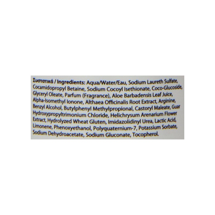 전성분:수,설대 레스 유산Na,코가《미도푸로피루베타인》,여기 이 루이《세치온》산Na,야자유 앨 킬《구루코시도》,올레인산 글리세릴,향료,알로에《베라》액즙,앨《데아》근 엑기스,아르기닌,《벤지루아루코루》,말레이 인산 변성 한가《시》유,《구아히도로키시푸로피루토리》《모니우무쿠로리도》,헤리 크리스《무아레나리우무》꽃 엑기스,가수분해 COM gig《루텐》 고, 이《미다조리지니루우레아》,유산,회 노《기시에타노루》,폴리 쿠오《다니우무》-7,솔 빈산K,데《히도로》초산Na,《구루콘》산Na,토코 fellow《루》